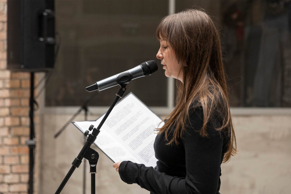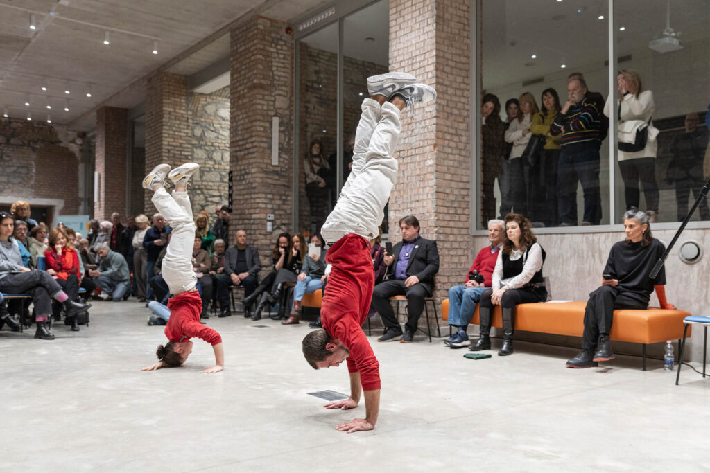 Hajnal Németh, “BREAK DANCE BREAK”, 2026, cyclical, repetitive performance, Ferenczy Museum Center – ArtMill, Szentendre, Performed by Júlia Koffler (speech, vocals), Stay Fresh Crew – Dániel Erdei and Csenge Szarvák (break dance), Photo by Balázs Deim