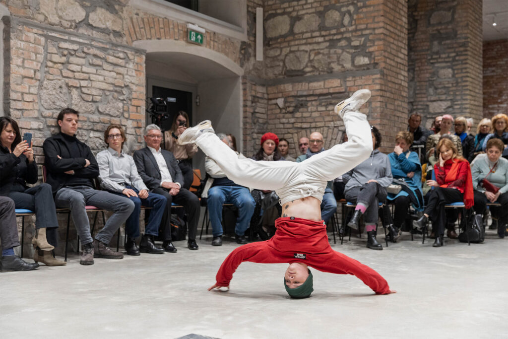 Hajnal Németh, “BREAK DANCE BREAK”, 2026, cyclical, repetitive performance, Ferenczy Museum Center – ArtMill, Szentendre, Performed by Júlia Koffler (speech, vocals), Stay Fresh Crew – Dániel Erdei and Csenge Szarvák (break dance), Photos by Balázs Deim